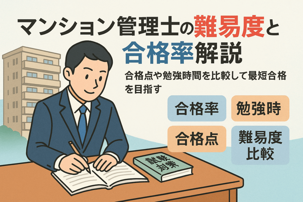 マンション管理士の難易度は、不動産系の中でも上位に位置づきます。宅建は宅地建物取引業法や民法など売買寄りの法令中心で、合格率はおおむね15%前後です。管理業務主任者は管理受託契約や標準管理委託契約書、会計や建築設備の実務知識が多く、合格率は20%前後で推移します。これに対しマンション管理士は区分所有法、標準管理規約、民法、建築設備、管理組合運営などを横断し、要求知識が広く深いことが特徴です。合格率は一桁台後半から一割前後で、出題の難化や合格点調整の影響を受けやすい傾向があります。学習時間も宅建より長めとなり、体系立てた学習計画が不可欠です。