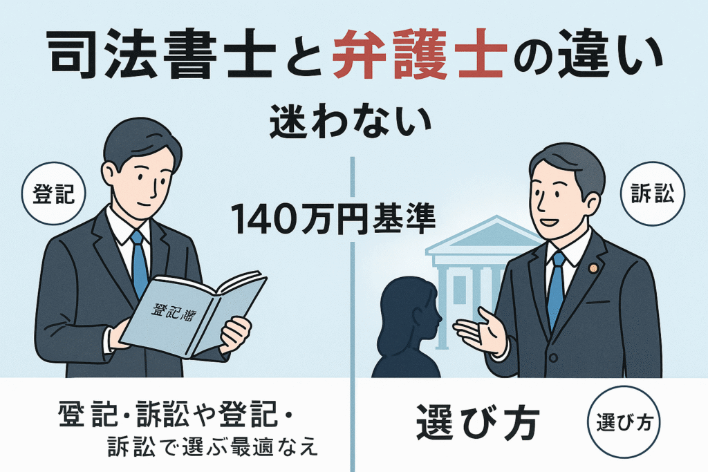 「この相談、弁護士?それとも司法書士?」——迷いがちな分かれ目は実はシンプルです。争いの有無、手続の種類、そして金額の規模。とくに、簡易裁判所の上限である「訴額140万円」は判断の重要な目安になります(裁判所法33条)。相続登記や会社登記など書類中心か、交渉・訴訟まで見据えるかで選び方は大きく変わります。
