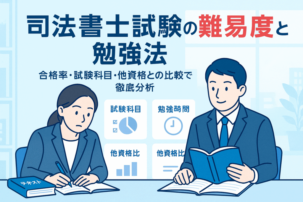司法書士試験は「司法試験」と並んで難易度が高い資格とされ、行政書士や社労士、税理士より格上と評されます。 実務に直結する法律知識の量と質、記述式試験のハードル、複数科目をバランスよく習得する必要性が難関度を上げています。他士業と比較して「司法書士 難易度ランキング」でも常に上位に位置しており、「人生狂う」「無理ゲー」といった声も少なくありません。